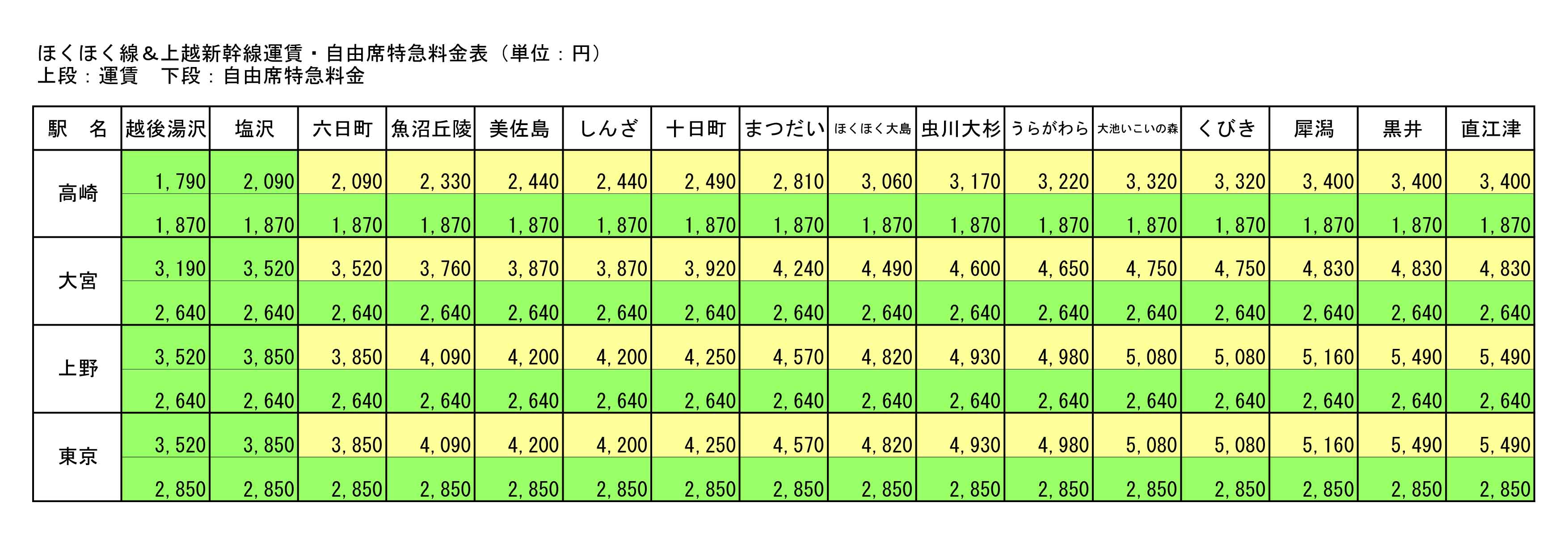 ほくほく線&上越新幹線運賃・自由席特急料金表