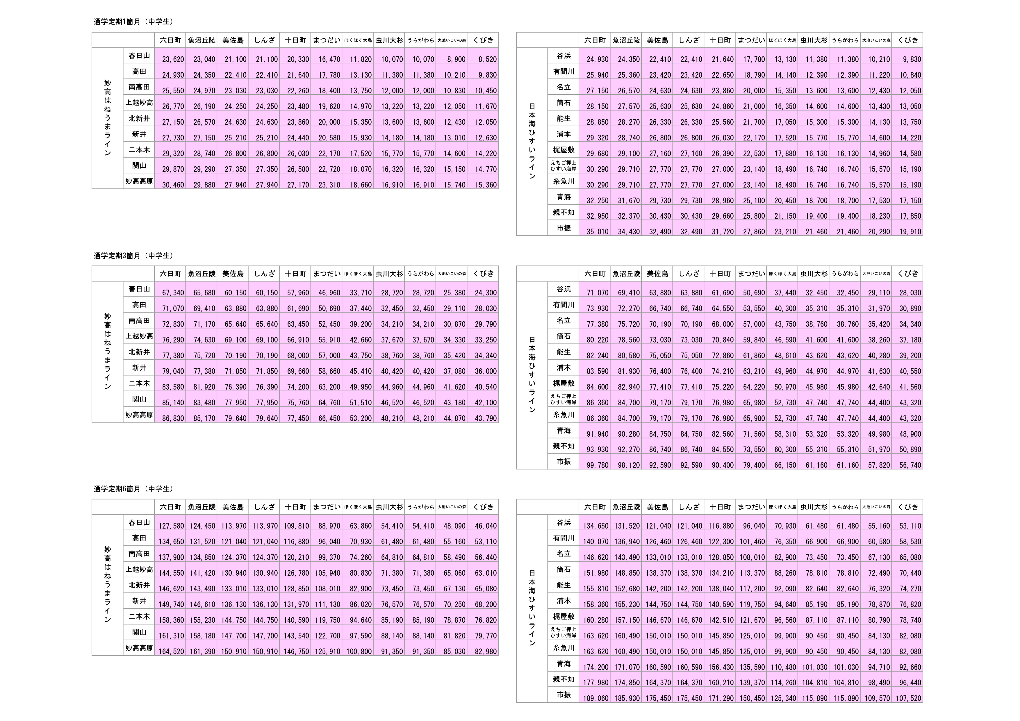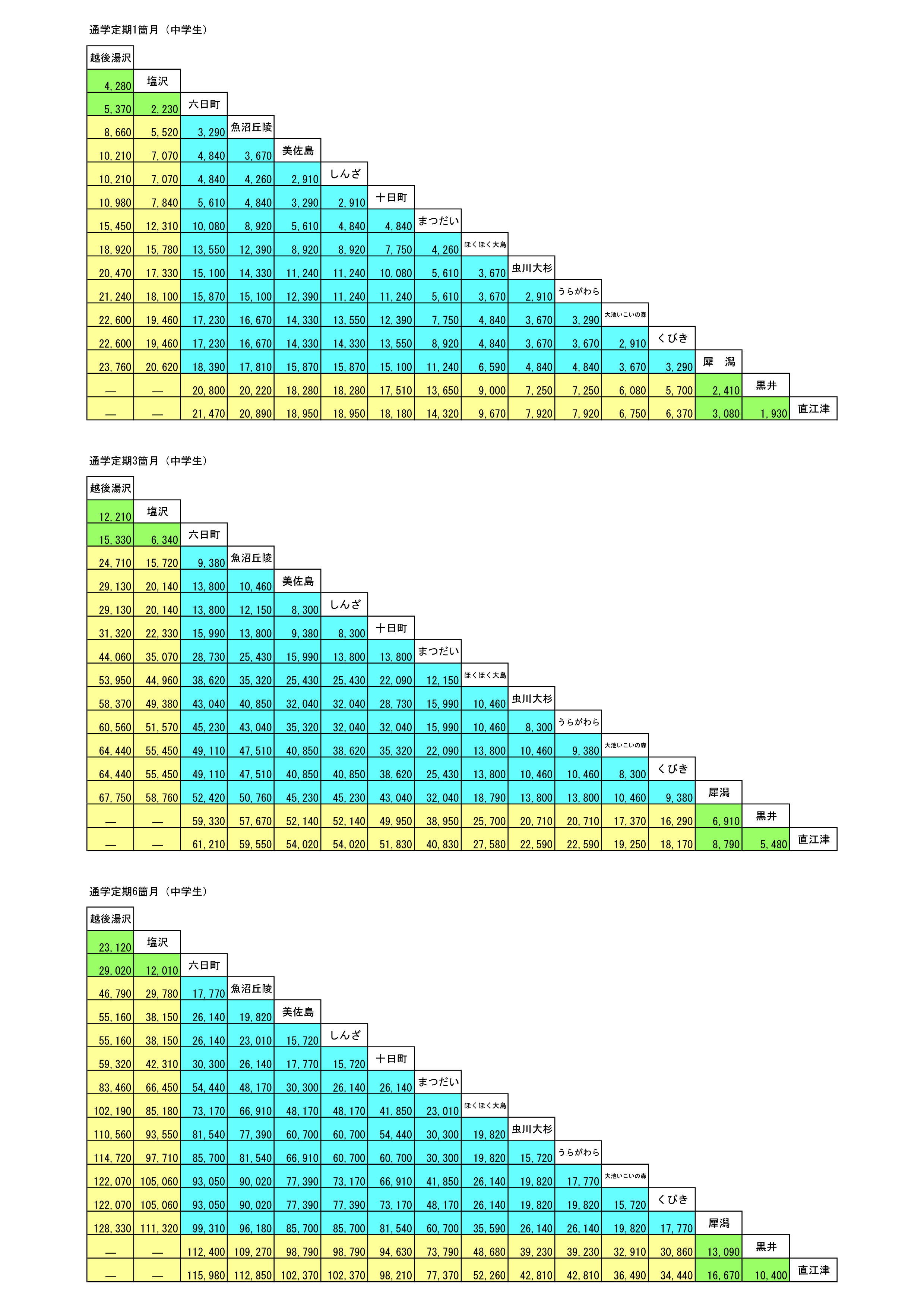 通学定期運賃表(中学生)