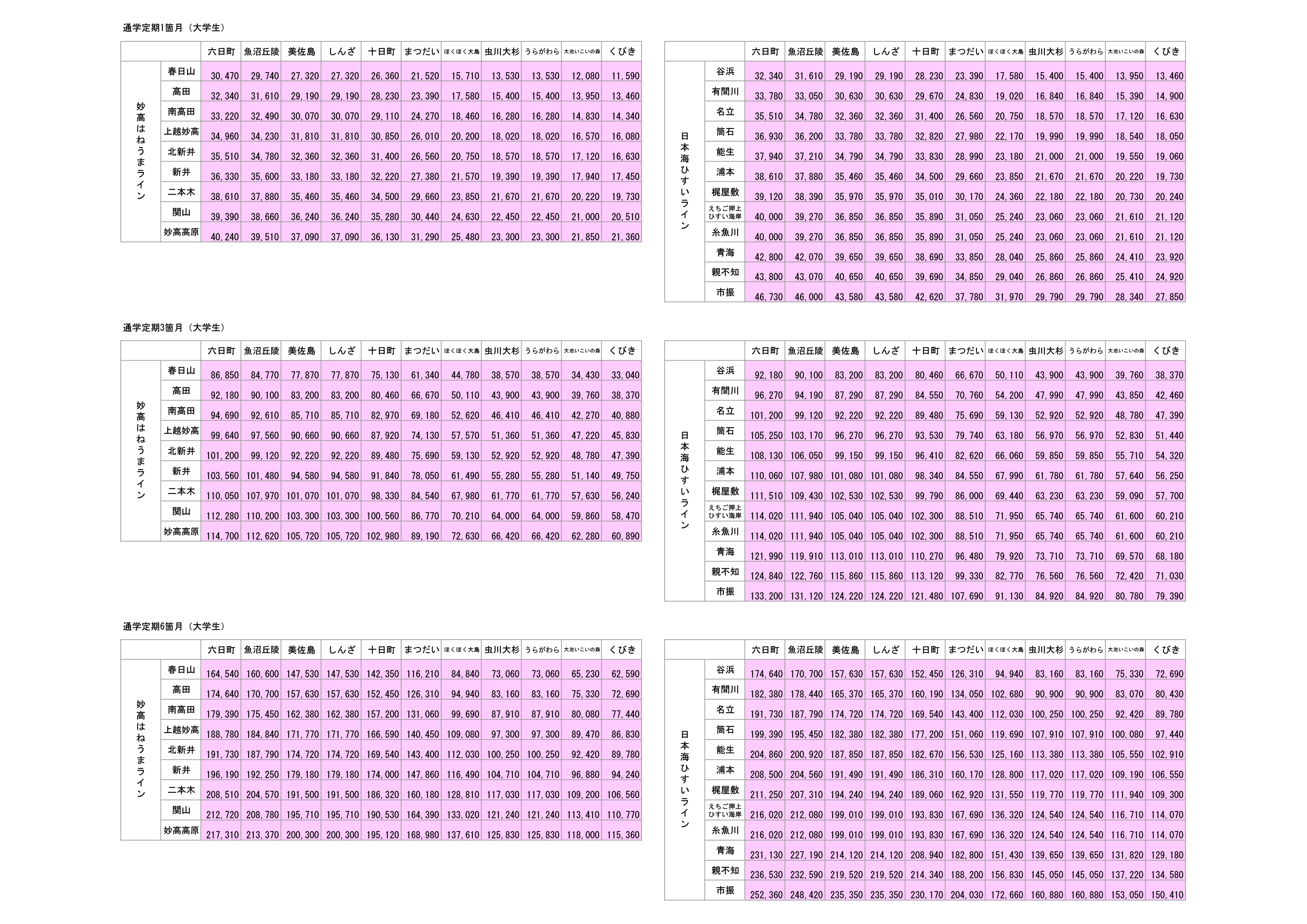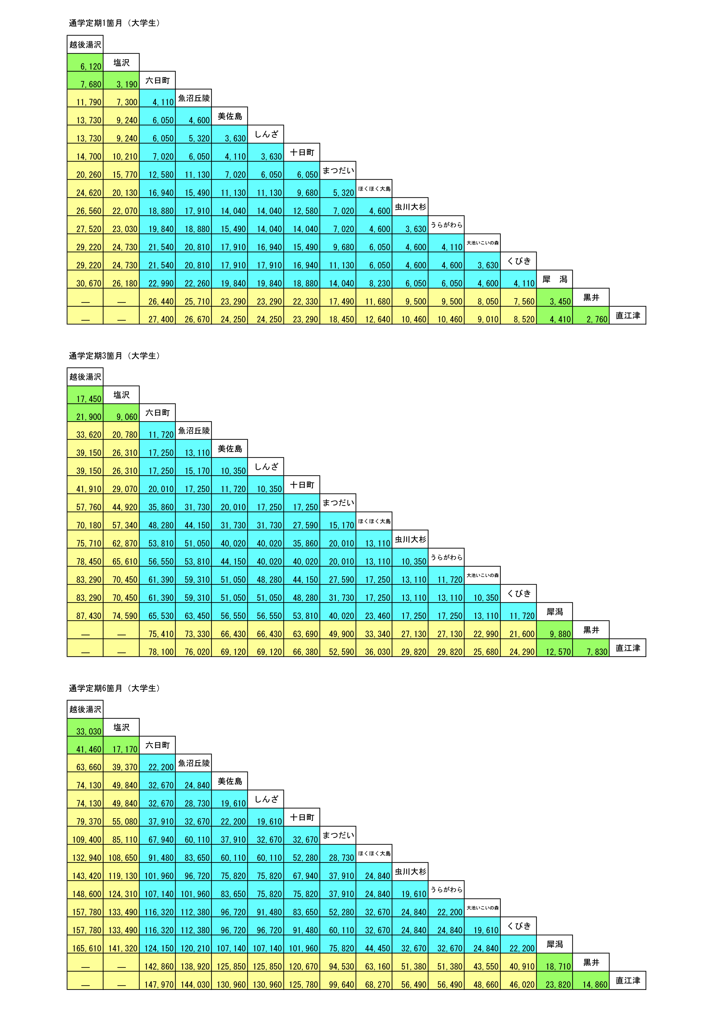 通学定期運賃表(大学生)