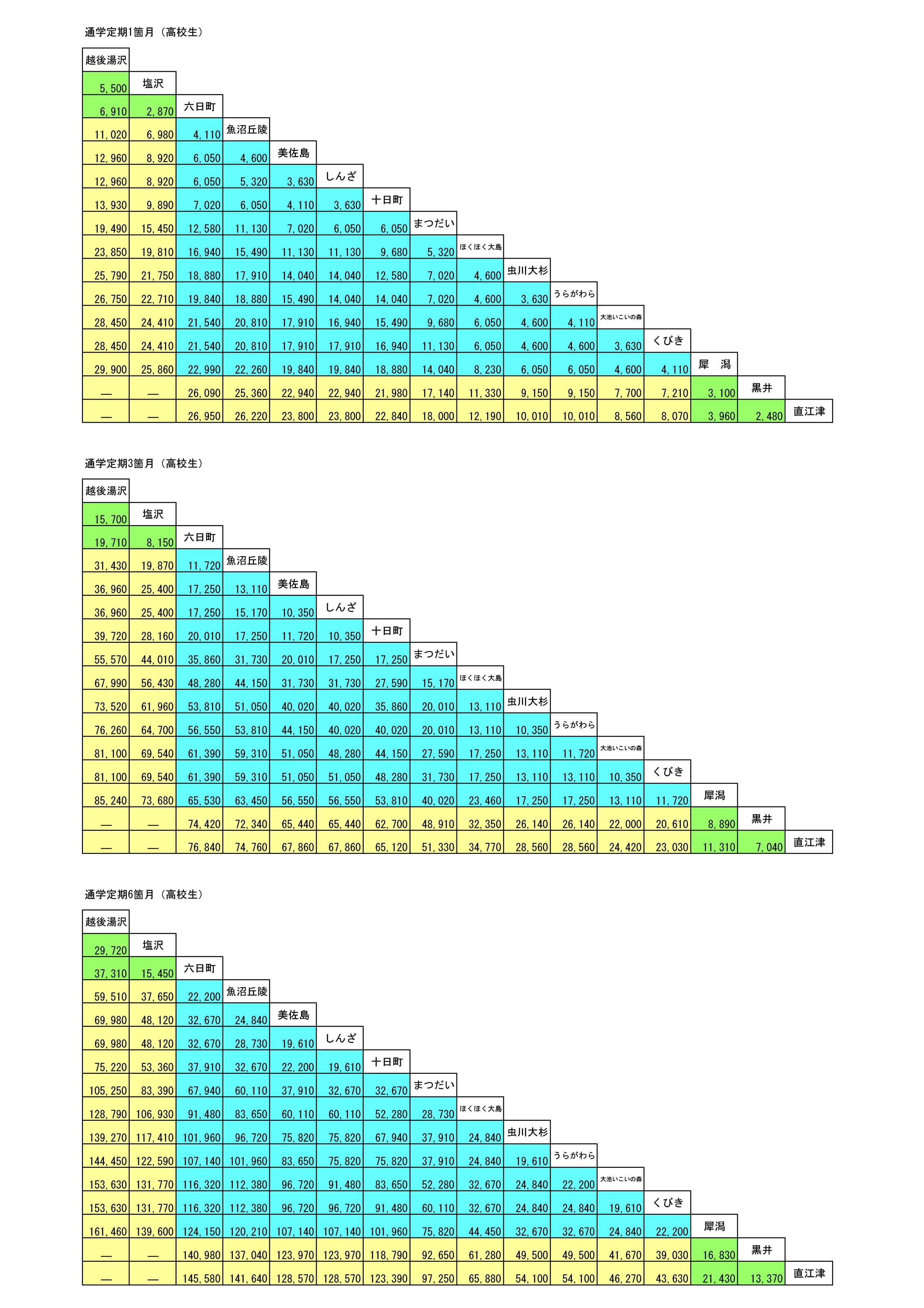 通学定期運賃表(高校生)